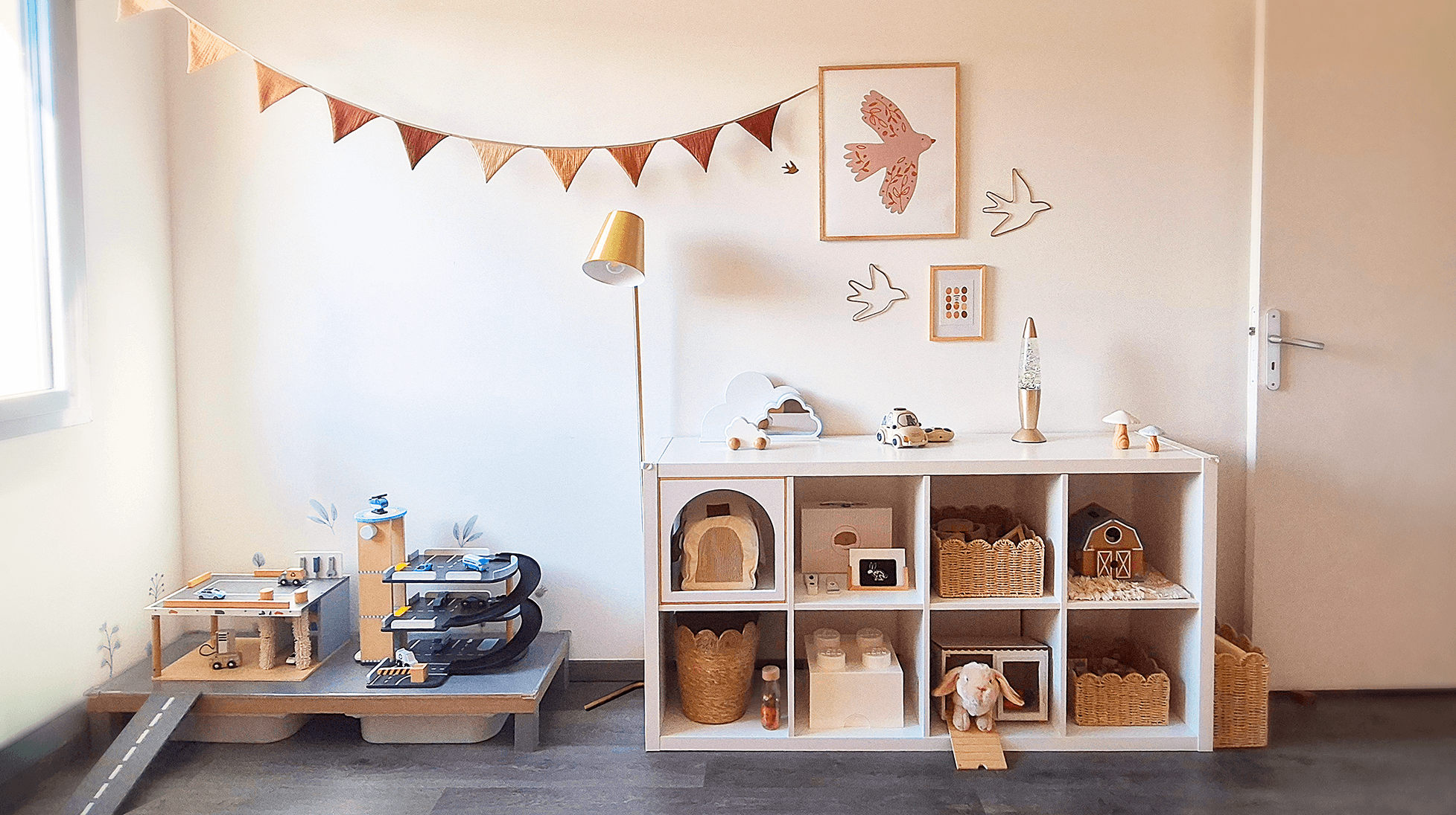 Une salle de jeux avec des jouets en bois variés, adaptés à leur âge, avec un système de roulement pour stimuler leur curiosité.